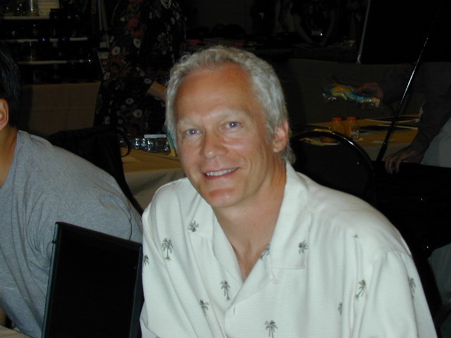 Several hours later I had mostly recovered and was sitting behind the PREY table when Joel de la Fuentes and a man walked by. A few of the preymates were wondering who the other fellow was. I looked up and frowned – he looked kind of familiar, so I followed them into the dealer room where Tucker Smallwood was ensconced behind the autograph table. They split up and a minute later another familiar face wandered by. My jaw dropped…it was Rodney Rowland! He hadn’t even been in the list of possible attendees! My brain finally kicked into gear and I realized the other man had been Morgan Weisser. His hair was cut shorter than a genuine marine’s and he was wearing glasses that looked like the PX had issued them…it definitely did not do him justice. I dashed back to the PREY table to report and found Lee Ann in a tizzy. She had recognized Rodney as he walked through the courtyard and was literally speechless. Well, she was making noises, but only the kindest person would classify those noises as speech.