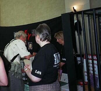 It was the first day of the con and we were excited. We called for a bellman to take down the things for the PREY table, as all of our volunteers seemed to have overslept. After getting everything down to the convention hall, we put together the cage and set up our stuff on the table. We had tons of stuff. PREY Pens, PREY Pencils, Bumper Stickers, Magnets, Bookmarks, Key Chains, T-Shirt Transfers, Stickers, Postcards, Petitions, and the autographed photos of Debra Messing. Also decorating our area was a working microscope complete with hair samples from ‘Tom’ and ‘Lynch’, and a gorilla in a cage that sang ‘Rescue Me’ when you squeezed his paw. Lee Ann’s photo collection was up on the wall. One end of the table held the TV and VCR that played our tapes over and over. In the center was a stand with 36 international flags representing all of the countries where PREY fans live. It was very impressive. The other end held the big cage with the cutout of Tom inside…and all over the place hung an assortment of monkeys wearing ‘You Will All Die’ signs.