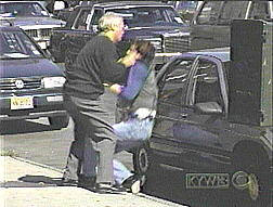 Two police cars pull up. From the first car to stop, young officers Phil Roussakoff and