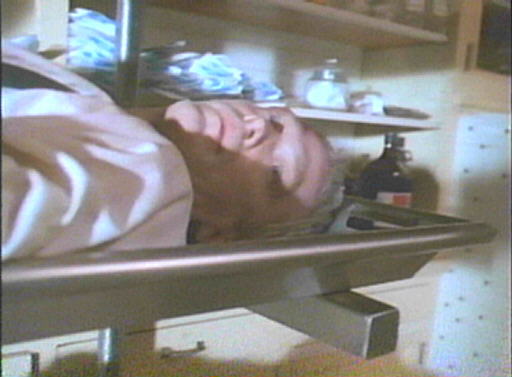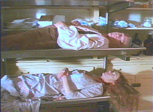 two lifeless bodies of Peter and Emma are lain on horizontal racks on the wall. Their