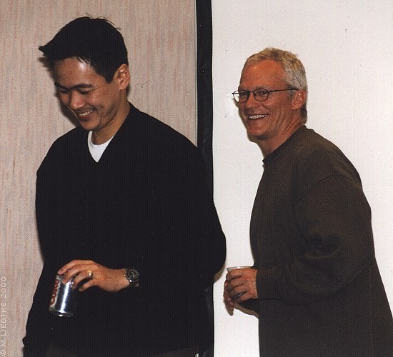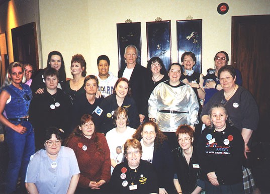 Later that evening we got down to the really serious stuff the disco! James and Joel appeared about 11pm, after having dinner with the con committee. Joel was very interested in the fan's rendition of 'Star Trekkin'! (A song from about 12-15 years ago, which has it's own special dance and is an absolute *must* at UK SF con discos.)