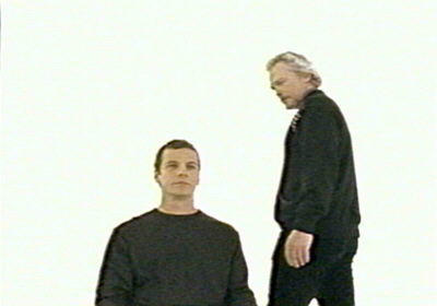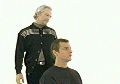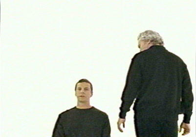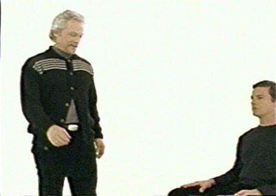 white room with no doors and no windows, Lewis circles Tom, who is seated in a chair.