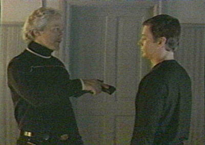 points his gun at Lewis. "What's this all about?" Tom keeps the gun pointed at
