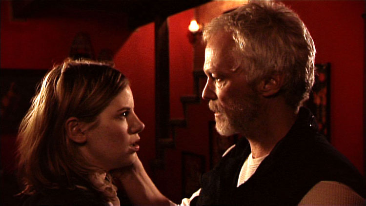 Meanwhile, Ed has been busy. He realizes that Ruth is suffering from low self-esteem and is terribly naïve, and charms her into untying him. He probably would have just taken his stuff and left, but Debbie and Katie burst in through the door at the crucial moment and he takes Ruthie hostage. He collects their cash and driver’s licenses, tells them that he will leave and not hurt them, but if they report him to the police he will come after them when he gets out. He instinctively recognizes Katie as being the one who will be the most trouble, has her tie the other two up then uses the rifle to herd Katie upstairs so he can pack his stuff while keeping an eye on her. He ties her to the bed there, and begins to pack, not otherwise touching her. For someone with her psychological problems this is a slap in the face. While she is working on the ropes, and as we can see succeeding, she goads him into physically attacking her. Even now, when she’s called him all sorts of vile names, he only grabs her face and basically tells her off. She gets free of the ropes, knees him where it counts, grabs the rifle, and fires it, badly grazing his neck.
